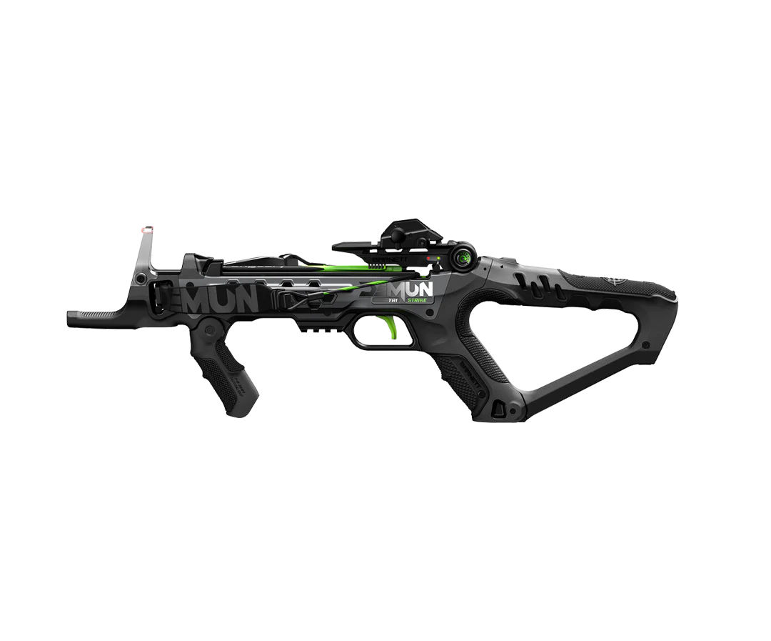 La Demun Tri Strike es una ballesta compacta de triple disparo diseñada para quienes buscan rapidez, versatilidad y potencia en un diseño ultracompacto. Su mecanismo de tres rieles permite disparar tres virotes de manera consecutiva, ofreciendo una cadencia superior frente a las ballestas de un solo tiro, sin sacrificar control ni precisión.