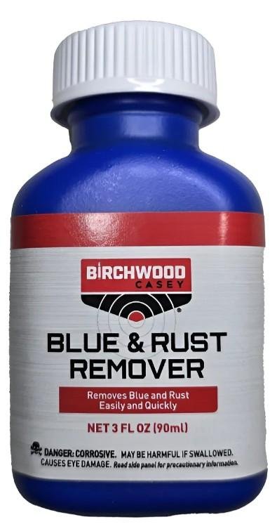 Birchwood Casey Removedor de óxido y azul. Solución segura y confiable que elimina el óxido y el azul viejo fácil y rápidamente sin dañar el metal base. Adecuado para retirar el acabado antiguo de armas de fuego, cargadores de boca y antigüedades. Excelente para quitar el óxido de herramientas, medidores e instrumentos de precisión. La eliminación del azul y el óxido es un paso necesario antes de proceder a procesos de azulado o dorado. Contenido: 3 fl. ozs.