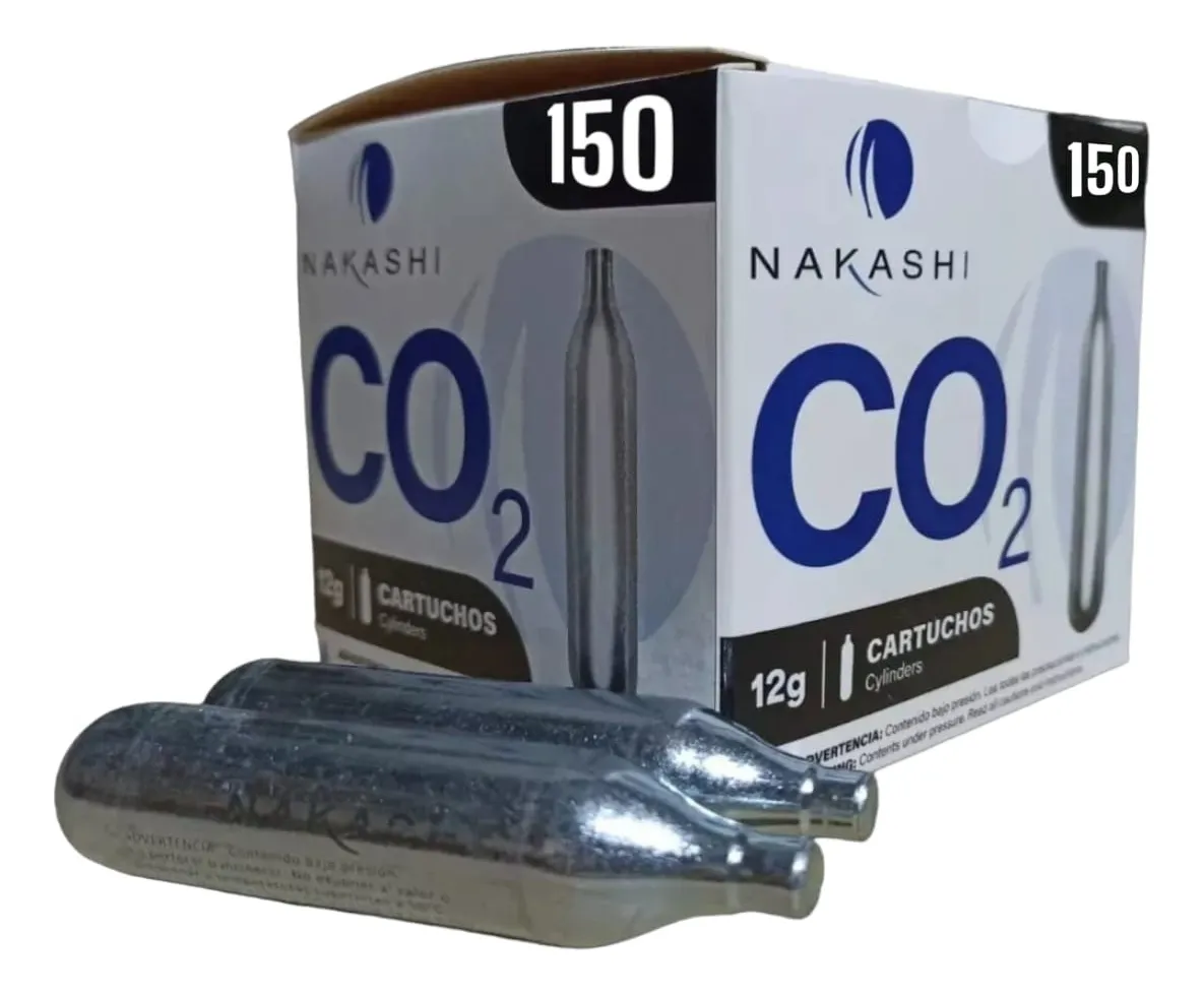 Cartuchos De Gas CO2 NAKASHI De 12g, Caja Con 150 fiables y eficientes para pistolas y rifles de aire comprimido.