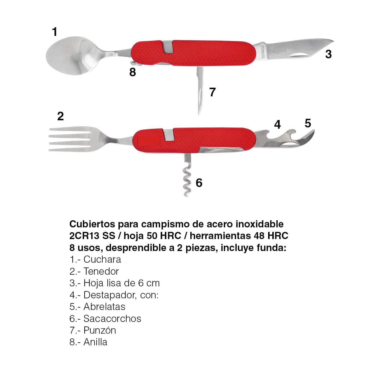 Características: Cubiertos de aluminio de 8 usos, ligeros y duraderos.