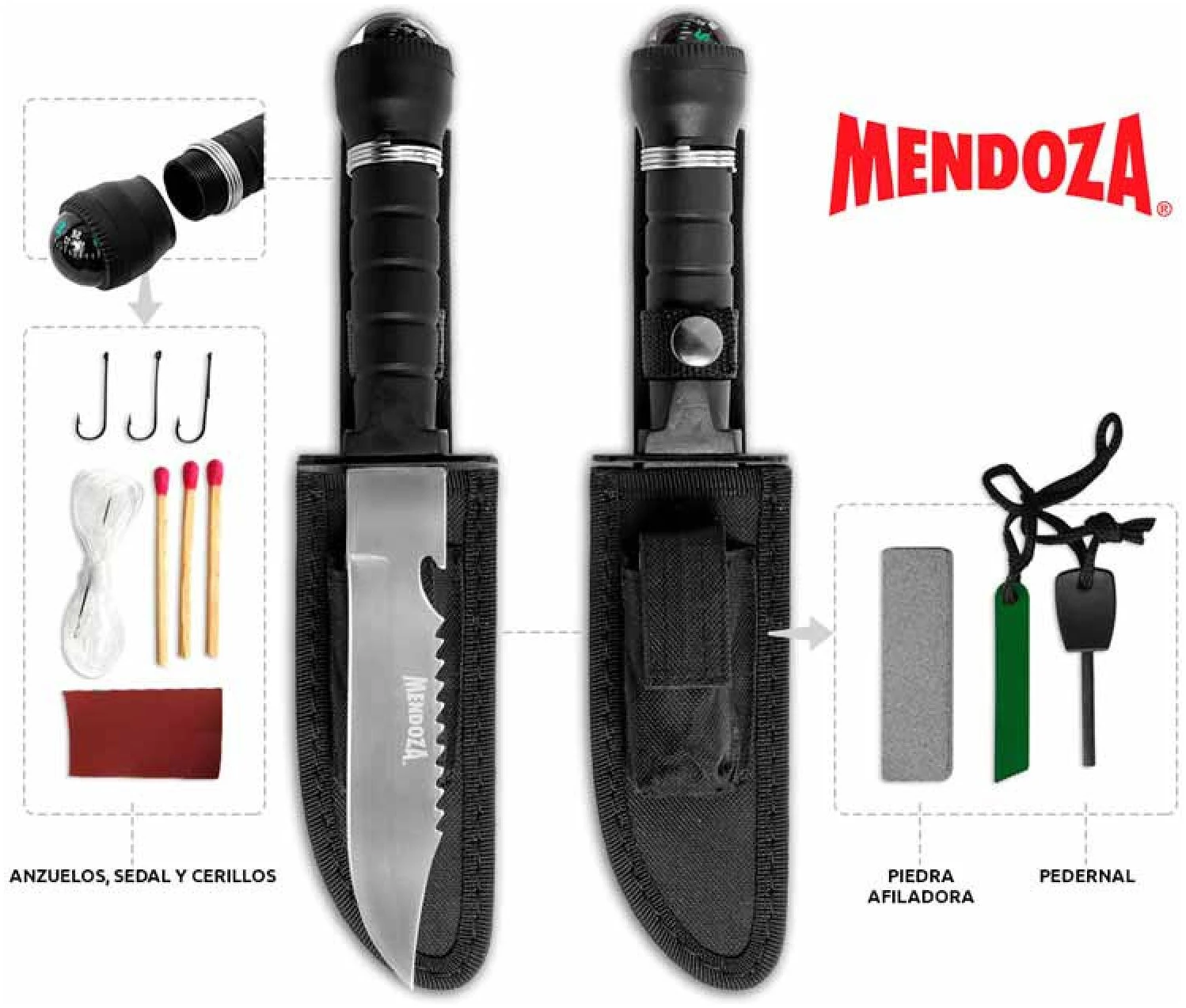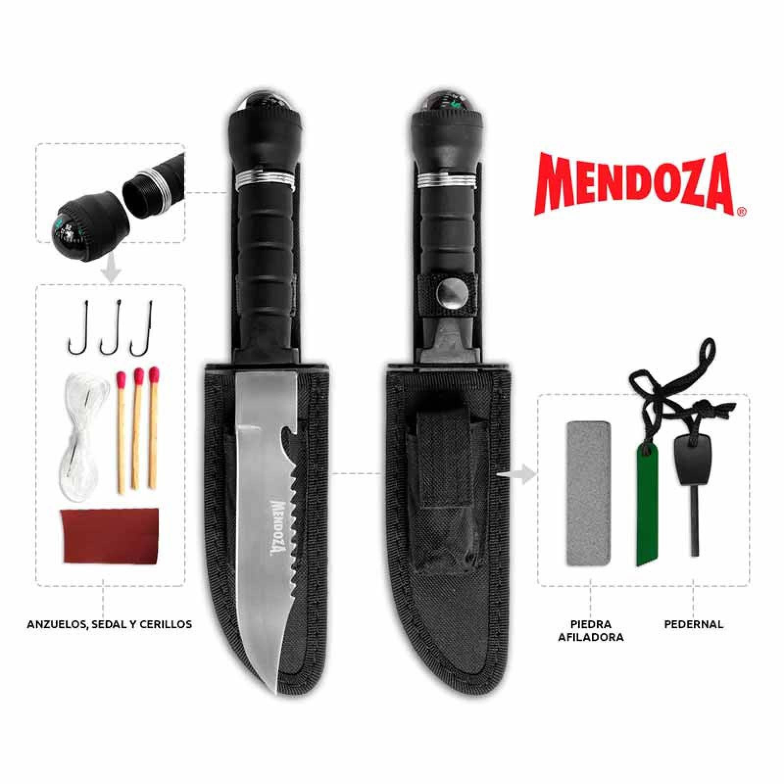 Características: Cuchillo de supervivencia Mendoza con kit de herramientas.