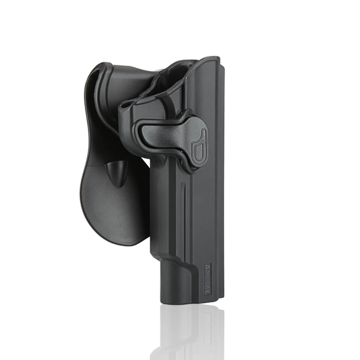 La funda táctica (holster) AMOMAX está elaborada en polímero de alto impacto, cuenta con una retención activa que consiste en un seguro de botón sumamente eficiente y cómodo para asegurar que el arma se libere sólo cuando usted así lo decida.