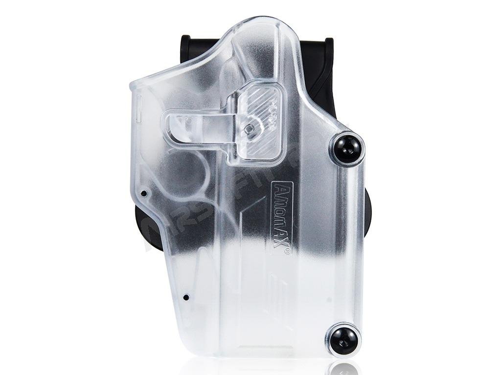 La liberación de la pistola de la funda se maneja presionando un botón en el lado de la funda - se agarra la pistola, se presiona el seguro con el dedo índice listo, y se saca la pistola de la funda. Esta solución es la forma más rápida de sacar o introducir el arma de la funda. Otra ventaja de la funda es la posibilidad de girar 360 grados con graduaciones cada 9 grados. Esto, junto con el seguro, permite que la funda se ajuste perfectamente a cada posición: detrás de la espalda (espalda pequeña), en el cinturón de lado (side draw), en el cinturón de frente (cross draw), en el chaleco, etc. El ángulo de la funda se ajusta a través de una junta dentada aflojando y apretando el tornillo Allen.