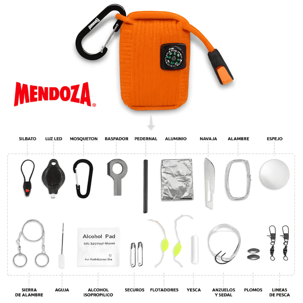 Características: Kit de supervivencia Mendoza Campismo, todo lo necesario para aventuras al aire libre.
