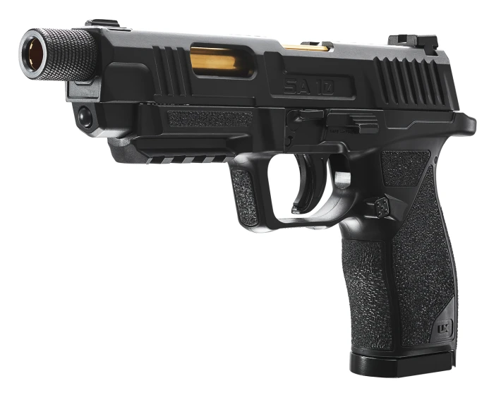 El diseño moderno de una pistola de acción se plasma en la pistola de aire comprimido Umarex SA10. Su corredera cuenta con un sistema de retroceso completo, lo que significa que se mueve o cicla con cada disparo. La SA 10, con munición dual, dispara munición de perdigones o balines a una velocidad de hasta 128 metros por segundo con la precisión típica de una pistola gracias a su cañón estriado. Esta pistola Umarex se distingue de otras pistolas de aire comprimido en dos aspectos. En primer lugar, su cargador alberga una cápsula de CO2 de 12 gramos y un cargador giratorio de 8 cartuchos, además de tres cargadores adicionales que hacen que el tiro al blanco sea más divertido. Además, su corredera, con orificios laterales, revela un cañón dorado que combina con el bloque de cierre dorado, un aspecto exclusivo de la línea Umarex, pero similar al de algunas pistolas personalizadas. La SA10 cuenta con un riel para accesorios bajo la boca del cañón y miras tácticas que complementan esta atractiva pistola, y su boca está roscada para alojar un supresor falso, lo que le da un aspecto ultramoderno.