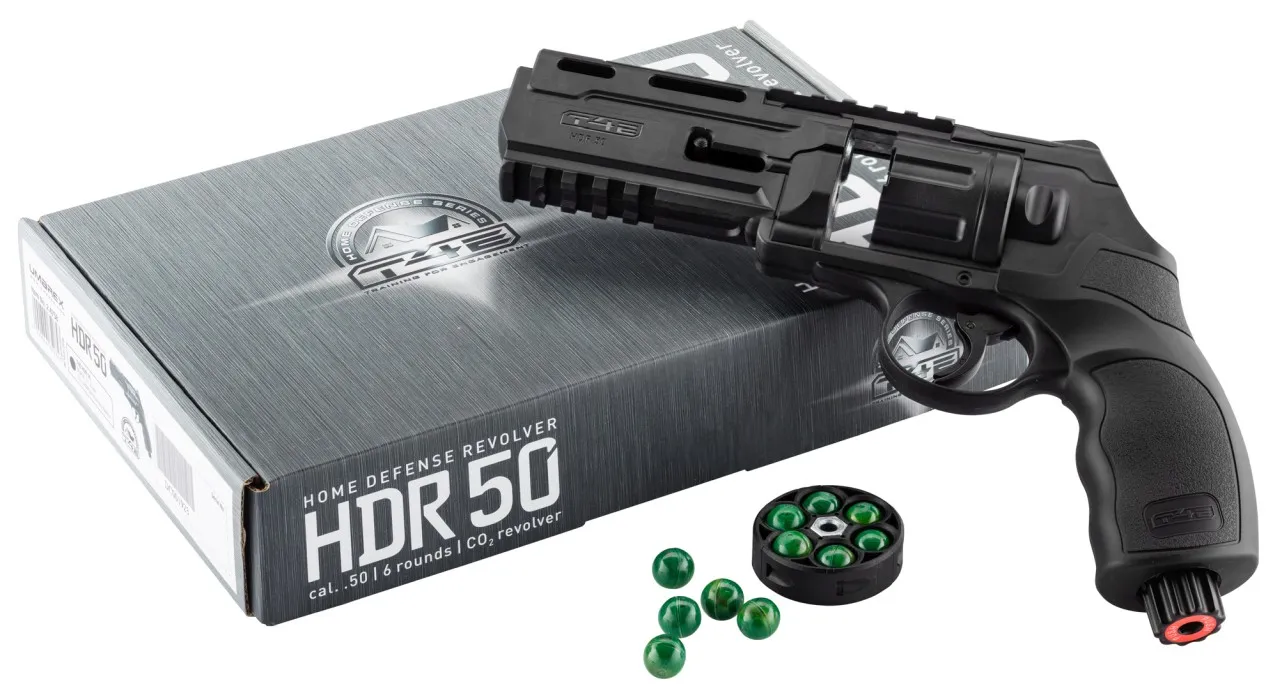 El TR50 Hellboy calibre .50 es un lanzador de aire comprimido tipo “revolver táctico” diseñado para defensa personal y entrenamiento. Funciona con cartuchos de CO₂ de 12 g, ofreciendo una potencia constante, disparos estables y un manejo intuitivo. Su estructura está construida en polímero reforzado, lo que lo hace resistente, ligero y fácil de maniobrar.